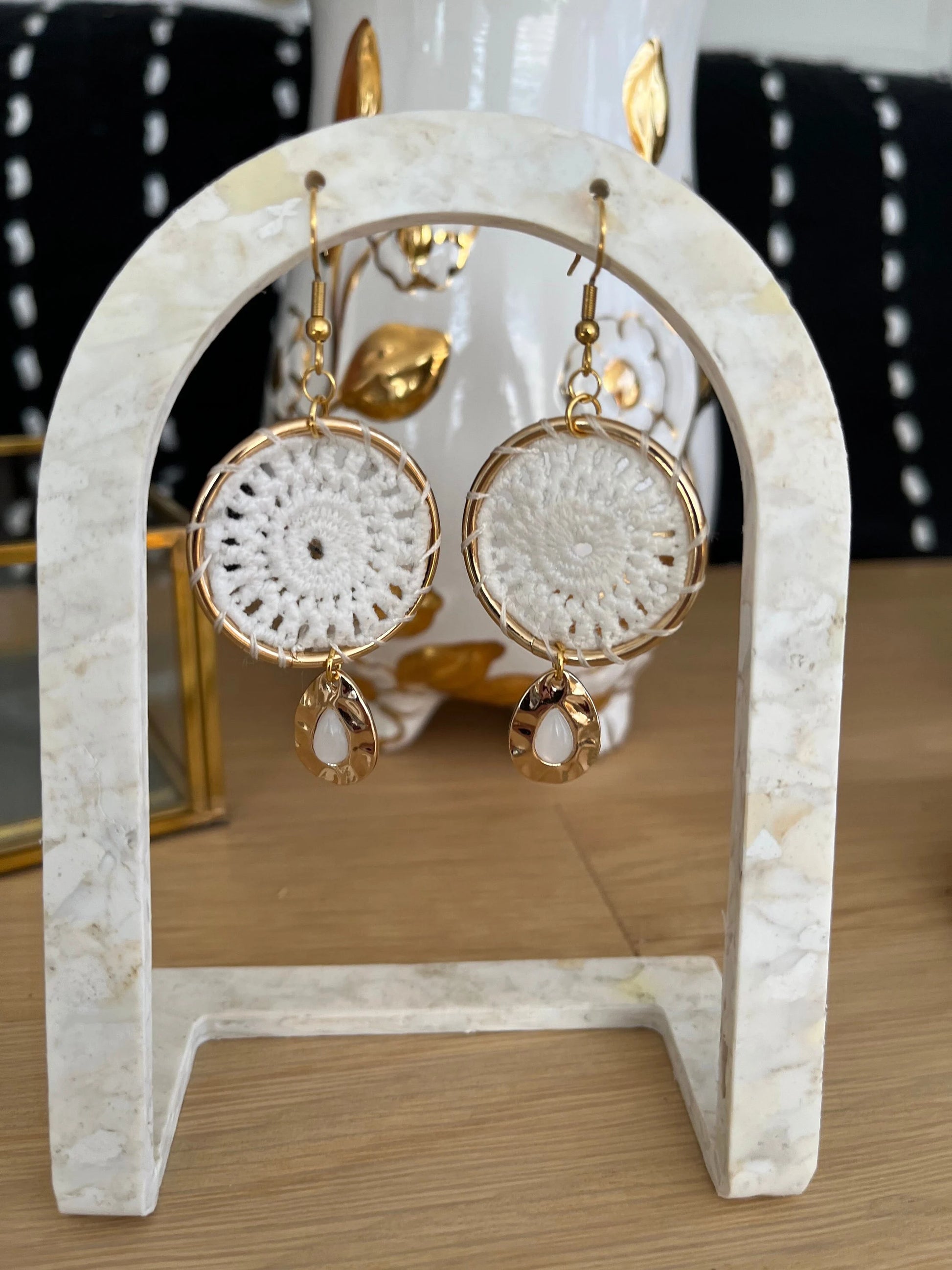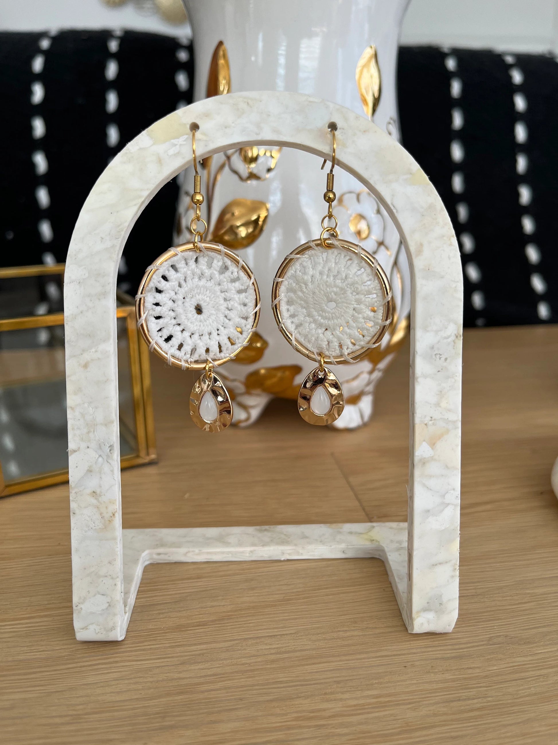 Boucles d’oreilles bohèmes ESMERALDA - en crochet blanc et doré