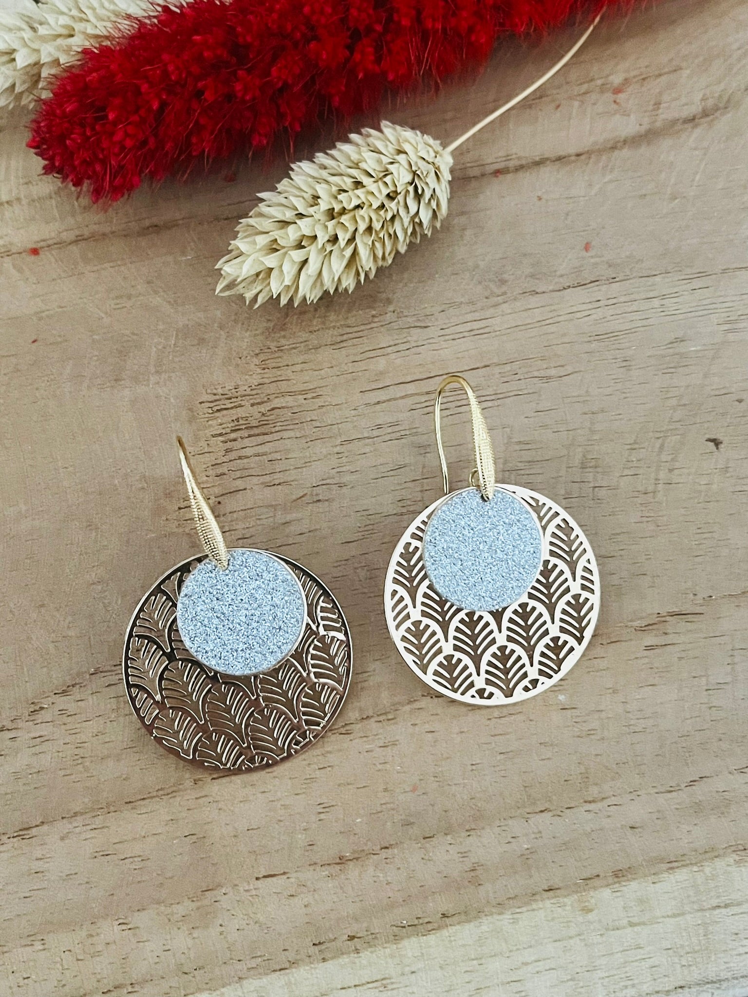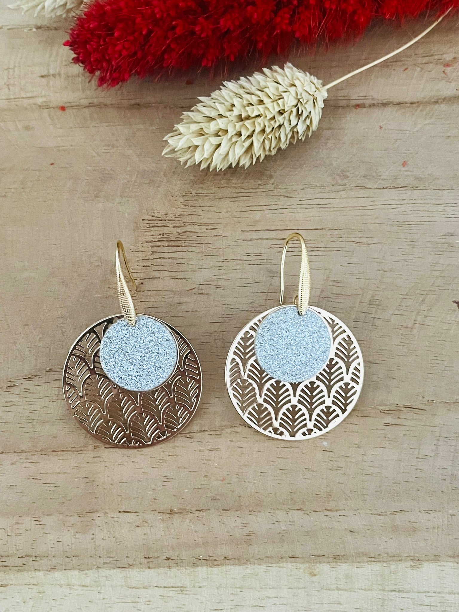 Boucles d'oreilles rondes SOLENN - doré et paillettes argentées