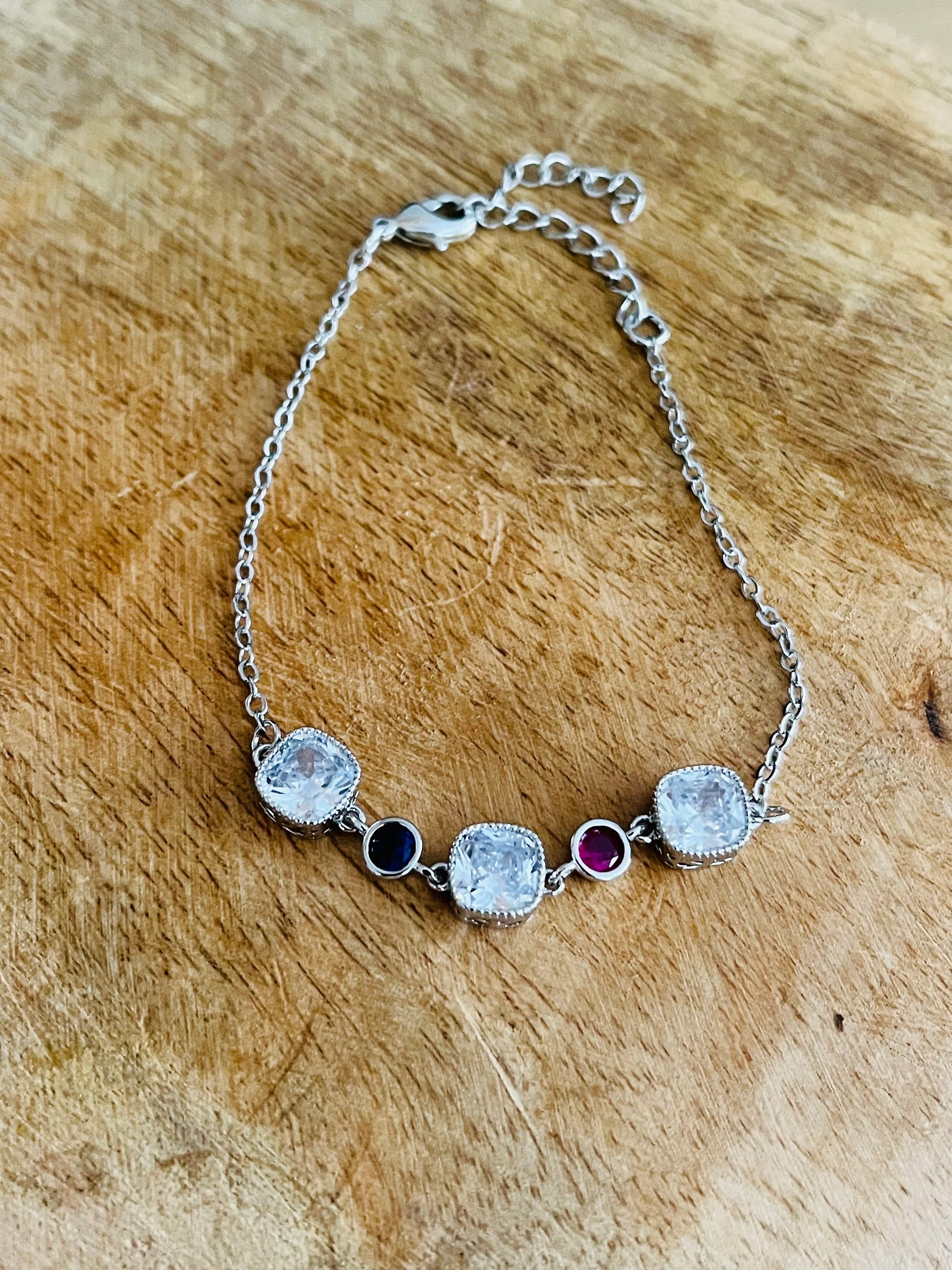 Chaîne fine et alternance de carré et rond en zircons bleu, rose fuchsia et cristal.