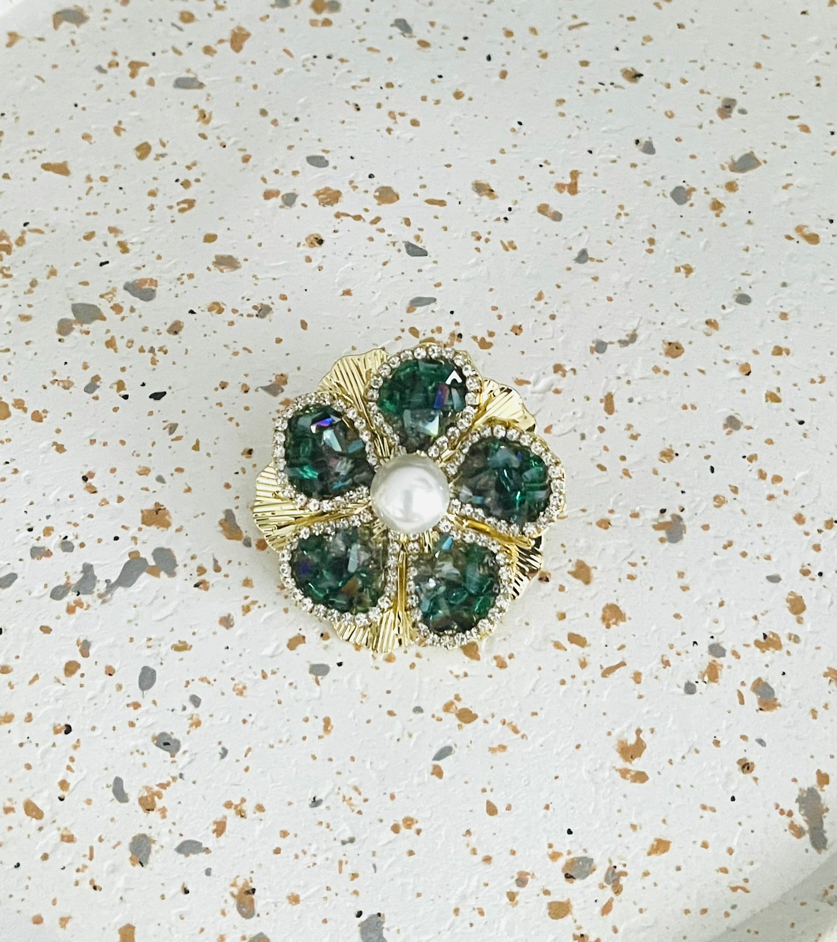 Broche fantaisie Fleur doré, vert et blanc nacré
