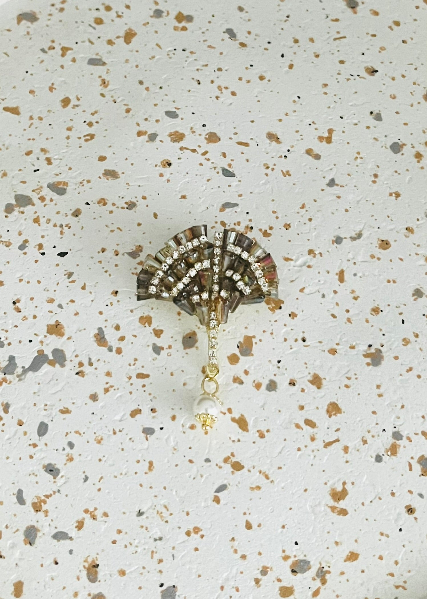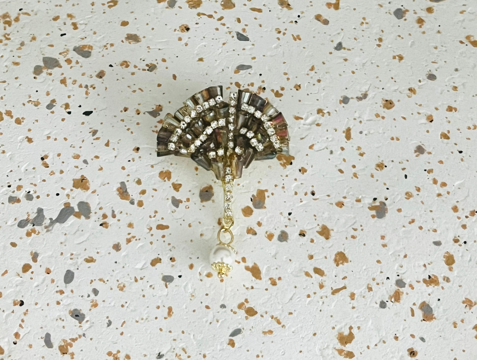 Broche Feuille de Ginkgo marron, strass et perle blanche
