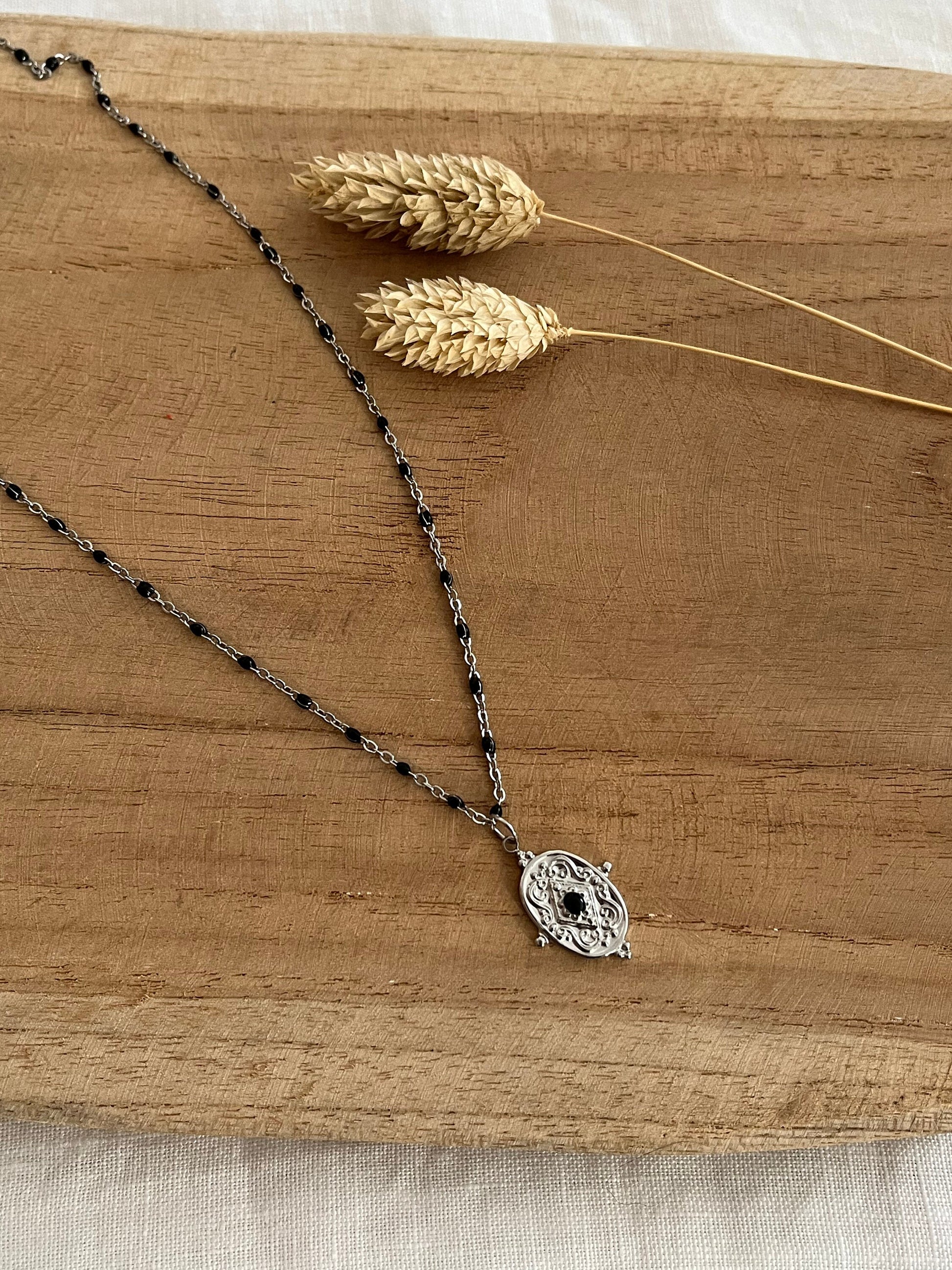 Collier en acier inoxydable avec pendentif ovale joliment travaillé.