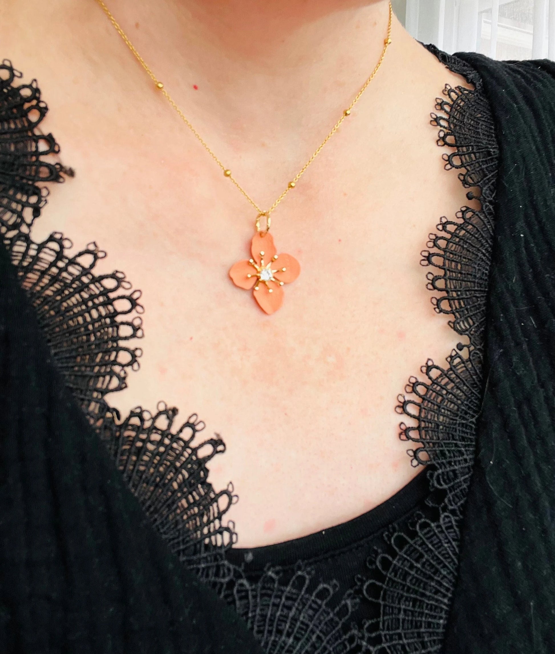 Joli petit collier avec son pendentif fleur de couleur corail et un strass.